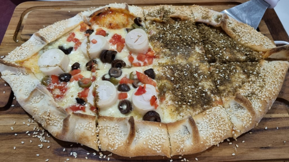 Os sabores salgados, todos com a base de muçarela e molho de tomate, são: Marroquina, que leva também frango defumado na manteiga e amêndoa em lascas; Libanesa, com palmito, azeitonas verdes e pretas e tomate; Árabe, a básica; Palestina, com zattar ou zaatar, mix de especiarias árabes; Egípcia, com escarola e nozes; Turca, com azeitonas e tomate; Shawarma de carne, com iscas de carne e especiarias; Shawarma de frango, com iscas de frango e especiarias; Síria, acrescida de cebola frita.