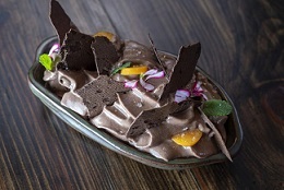 Nuu Nikkei: a sobremesa Chocolate 4 Texturas é um deleite para os amantes de chocolate. O preparo combina espuma, terra, sorbet e crocante, no qual cada camada revela um contraste de texturas e sabores que culmina em uma explosão de chocolate, finalizada com sal maldon.