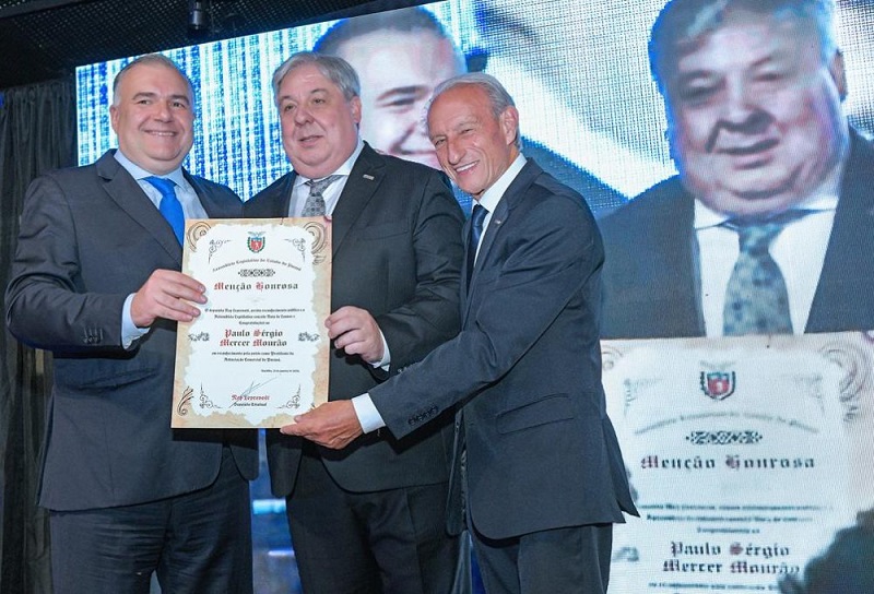Deputado Ney Leprevost (à esquerda), presente ao evento, entregou em mãos, ao Paulo Mourão, o certificado de Menção Honrosa, aprovado na ALEP. Ao lado estava Antonio Deggerone. Ney desejou ao novo presidente da ACP “uma trajetória de muito diálogo, inovação e fortalecimento do empreendedorismo paranaense.”