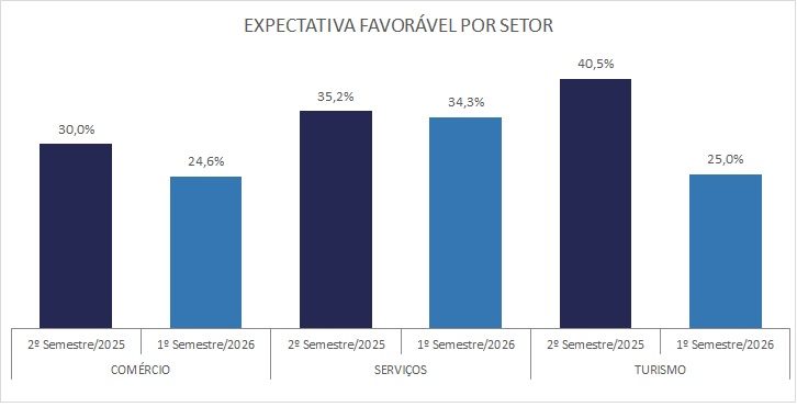 Entre os segmentos pesquisados, o setor de serviços apresenta o maior grau de confiança, com 34,3% de expectativas favoráveis. No turismo, esse percentual é de 25%, enquanto no comércio fica em 24,6%.