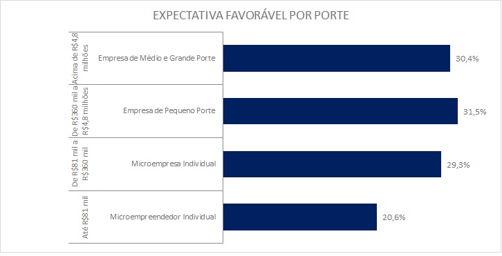 A análise por porte de empresa mostra que os pequenos negócios concentram maior otimismo, com 31,5% das empresas de pequeno porte avaliando o semestre de forma positiva, seguidas pelas médias e grandes empresas, com 30,4%. Entre as microempresas individuais, o índice de expectativas favoráveis é de 29,3%. Já no caso dos microempreendedores individuais, as projeções negativas superam as positivas, com 27% de avaliações desfavoráveis ante 20,6% otimistas.