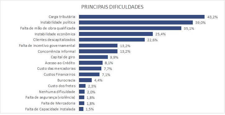 A falta de mão de obra qualificada surge como um dos gargalos estruturais mais relevantes. Com 35,1% das menções, e alta de 4,5 pontos percentuais em relação ao semestre passado, figura entre os mais elevados dos últimos 12 anos, evidenciando um problema recorrente do setor terciário. Também estão na lista de dificuldades a instabilidade econômica e a percepção de clientes descapitalizados.