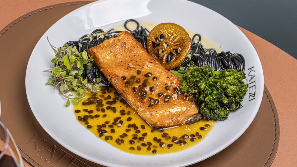 Salmão grelhado ao molho de maracujá, spaghetti nero ao creme de limão siciliano com brócolis alho e óleo - Foto: Ebraim Martini