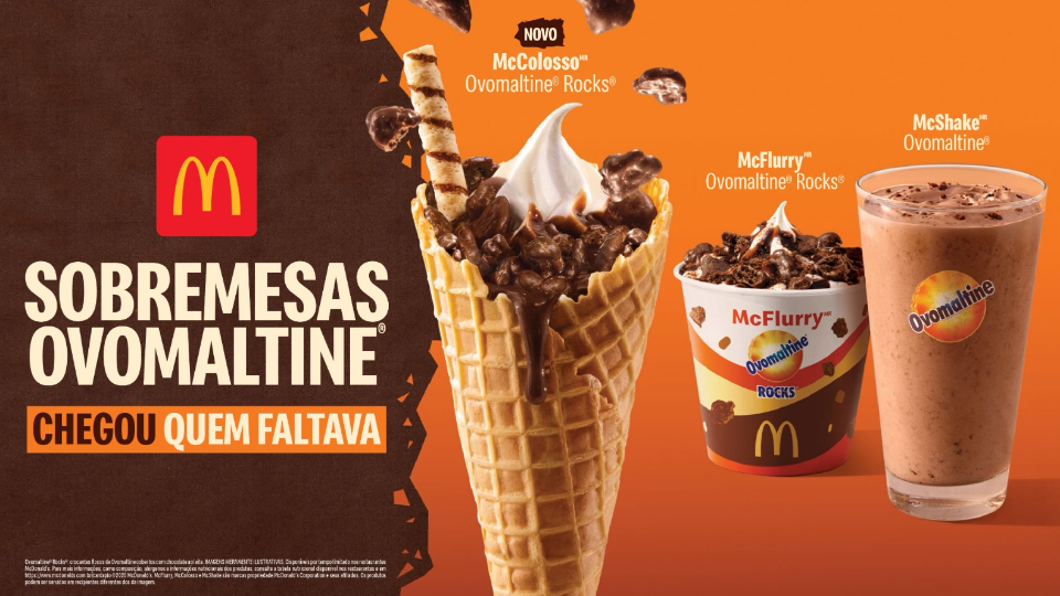 “Nossa plataforma de sobremesas não para de crescer. Há mais de 15 anos, o McDonald’s mantém uma parceria de sucesso com Ovomaltine, que já provou ser uma paixão dos nossos clientes. Para compor a família ao lado do McShake e do McFlurry, o McColosso Ovomaltine Rocks chega para completar esse trio de sucesso. O nosso consumidor já ama a parceria com Ovomaltine, e agora chegou quem faltava nos quiosques e restaurantes do Méqui”, conta