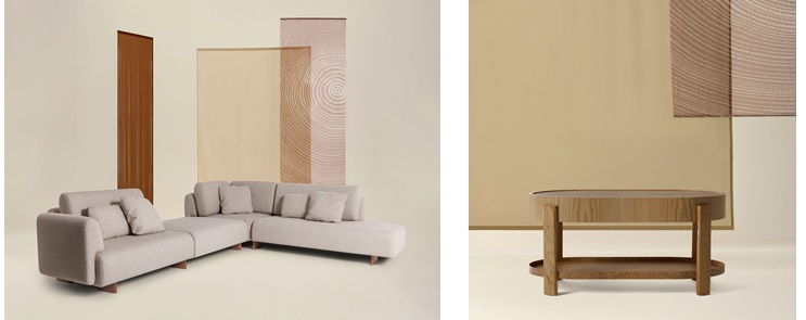 O equilíbrio entre tradição, inovação e conforto marcam os lançamentos. Nas imagens, o sofá Gengibre, projetado pela Plataforma4, e a mesa de cabeceira Órbita, do Estúdio Lider. Fotos: Divulgação/Lider.