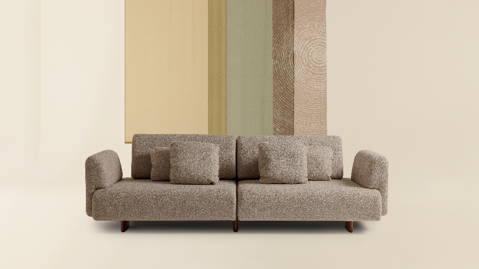 Encerrando o conjunto, o sofá Gengibre, criação da Plataforma4, revela o encontro entre conforto e harmonia. Suas curvas contínuas e o encaixe preciso entre assento, encosto e braços criam uma peça fluida e acolhedora, em que o vazio entre as quinas adiciona leveza visual e caráter escultórico.