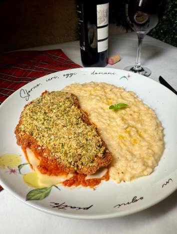 Já o Gran Filetto Alla Crosta Ritz é um dos grandes destaques da casa: filé-mignon empanado com crosta crocante exclusiva da chef, em uma releitura leve e sofisticada do clássico à Parmigiana. O prato é servido com molho de tomates frescos e risoto cremoso de limão siciliano, que traz frescor e acidez na medida certa.