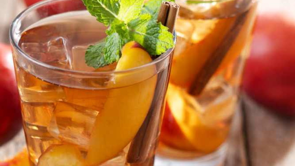 4. Chá gelado de pêssego e manjericão: prepare um chá verde, adicione pedaços de pêssego e folhas de manjericão e sirva gelado.
