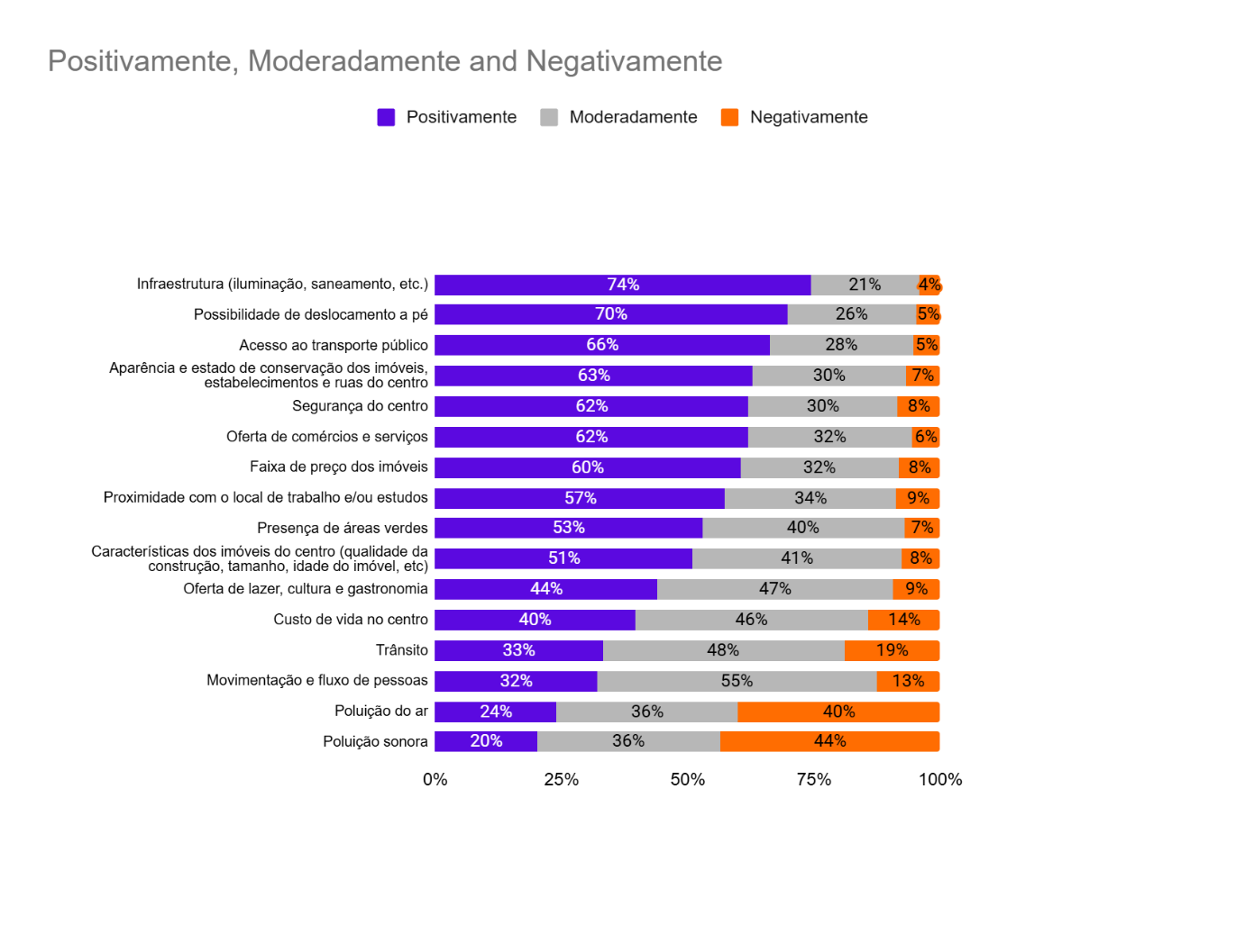 “Quando questionados sobre os fatores que mais contribuiriam para morarem em uma região central, 74% dos respondentes consideram a infraestrutura disponível. Também é interessante que a mobilidade se destaca, não só pela facilidade de acesso ao transporte público (66%), mas também pelo deslocamento à pé, que ficou na segunda posição dos fatores que impactariam na decisão (70%). Isso reforça o desejo das pessoas por uma cidade de curtas distâncias, o que impacta diretamente na percepção atrelada à qualidade de vida”, finaliza Taiane Martins.