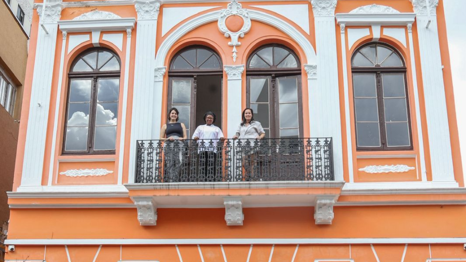 Gabriela Inácio, Alone Leal e Edite Ribeiro na sacada de ferro batido do prédio histórico