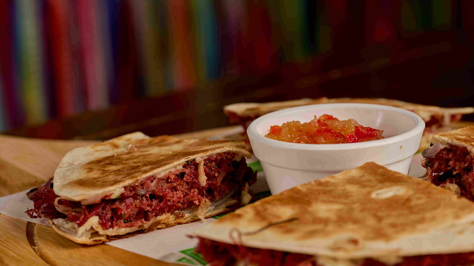 A massa é aquecida até ficar levemente crocante por fora e macia no centro, servida já cortada para dividir. Entre as combinações, estão a tortilha de cupim desfiado com molho barbecue e toque adocicado de goiabada (R$ 42,90); a carne seca com queijo coalho e geleia de abacaxi com pimenta (R$ 45,90); e a versão caprese, com burrata, tomate, rúcula e pesto (R$ 42,90), apresentada em meia-lua.