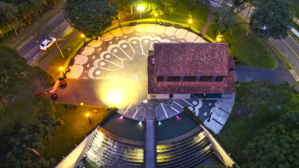 Foto: Hully Paiva/SECOMRefúgio ecológico e turístico da cidade, onde natureza, cultura germânica e histórias infantis se encontram, o Bosque Alemão, no Vista Alegre, está ainda mais bonito e atrativo. Quando escurece, a nova iluminação cênica recém implantada, coloca em destaque a fonte sob a passarela de madeira que liga a praça do Oratório de Bach à Torre dos Filósofos, o mirante de madeira com 15 metros de altura.
