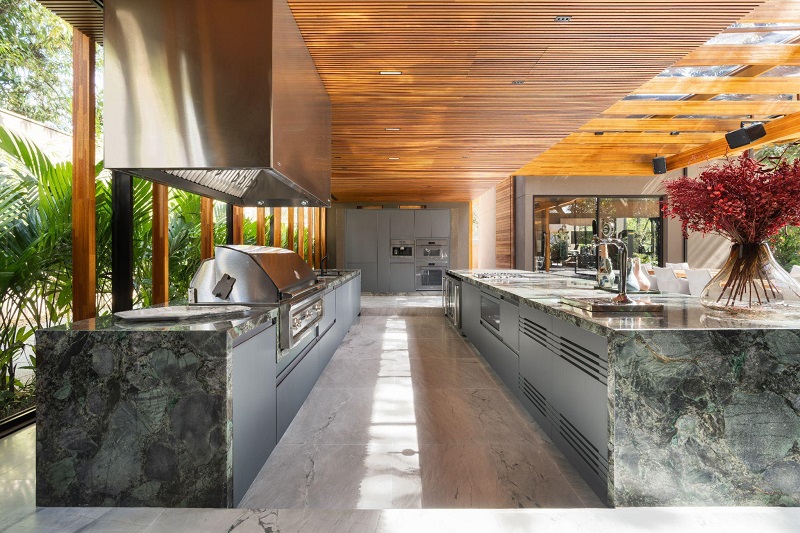 No projeto de João Armentano, a cozinha é concebida como um espaço de encontro, onde arquitetura, matéria e luz natural se articulam de forma equilibrada. As aberturas estruturais favorecem a ventilação e estabelecem uma conexão direta com o exterior, tornando o ambiente mais fluido e confortável.