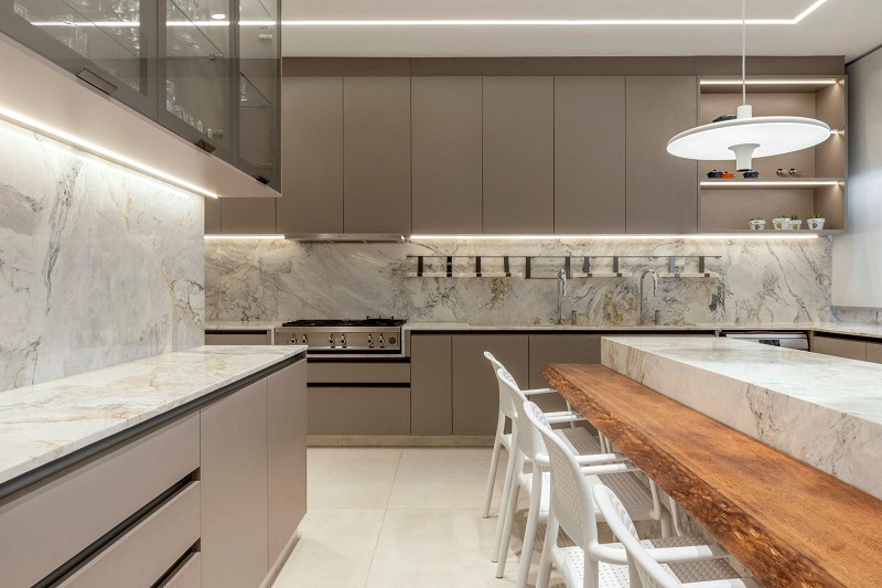 Já no projeto de André Lenza, a Linha Stripe evidencia uma composição precisa entre forma, matéria e função. Os traços contínuos e os puxadores integrados criam uma leitura limpa e essencial, em que cada elemento se conecta de maneira fluida à arquitetura.