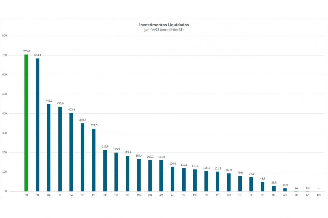 O Paraná foi o estado que mais investiu no primeiro bimestre de 2026 em todo o Brasil. Com R$ 703,6 milhões liquidados apenas entre os meses de janeiro e fevereiro, o Estado ficou à frente de Maranhão (R$ 684,1 milhões) e Bahia (R$ 449,1 milhões), que completam o pódio, e estados como Santa Catarina (R$ 350 milhões), São Paulo (R$ 213 milhões) Rio de Janeiro (R$ 119 milhões) e Minas Gerais (R$ 113 milhões). Os dados são da Assessoria Técnica de Economia (ATE) da Secretaria da Fazenda.