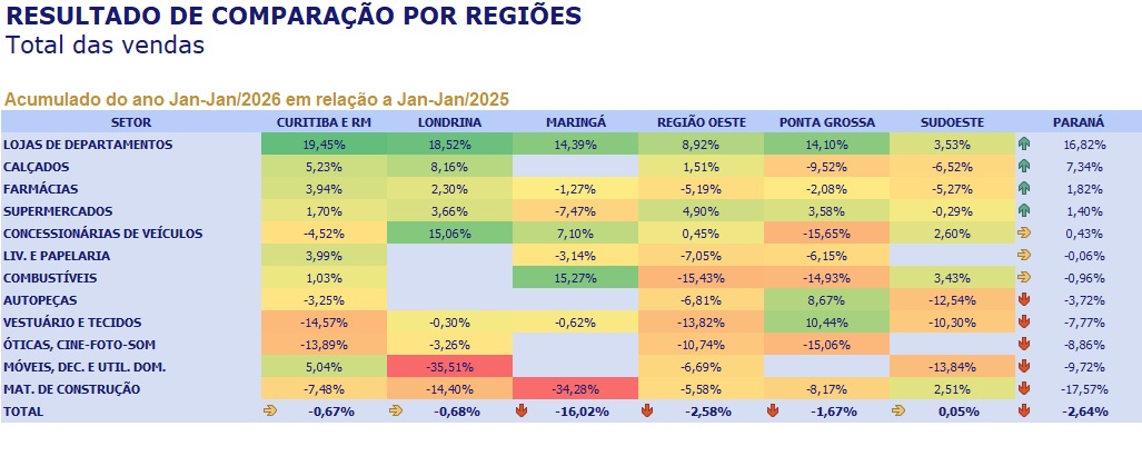 Nas demais regiões, o início do ano foi marcado por baixo movimento. Maringá apresentou a queda mais acentuada, de 16,02%, com forte desaceleração nas vendas de material de construção (-34,28%). O resultado reflete mudanças no perfil de consumo do setor, com maior participação de compras diretas da indústria por empresas de construção e engenharia. Por outro lado, segmentos como lojas de departamentos (14,39%) e concessionárias de veículos (7,10%) registraram crescimento.