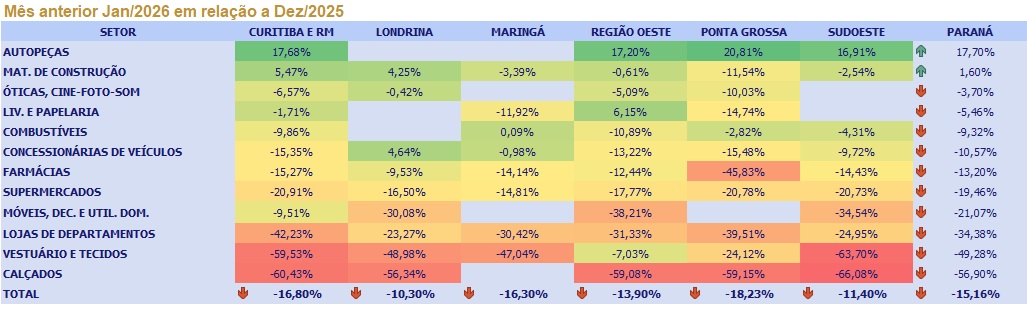 Os dados indicam um início de ano mais fraco para o varejo paranaense, após o aquecimento típico do período natalino. Na comparação com dezembro, o recuo sazonal foi de 15,16%.