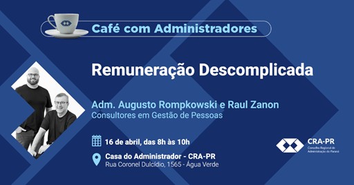 O Conselho Regional de Administração do Paraná (CRA-PR) realiza, na próxima quinta-feira (16), o Café com Administradores com o tema: “Remuneração Descomplicada”, na Casa do Administrador, em Curitiba. O encontro é o segundo desta modalidade do ano e traz um dos assuntos mais estratégicos em uma organização: a remuneração de cargos e salários.