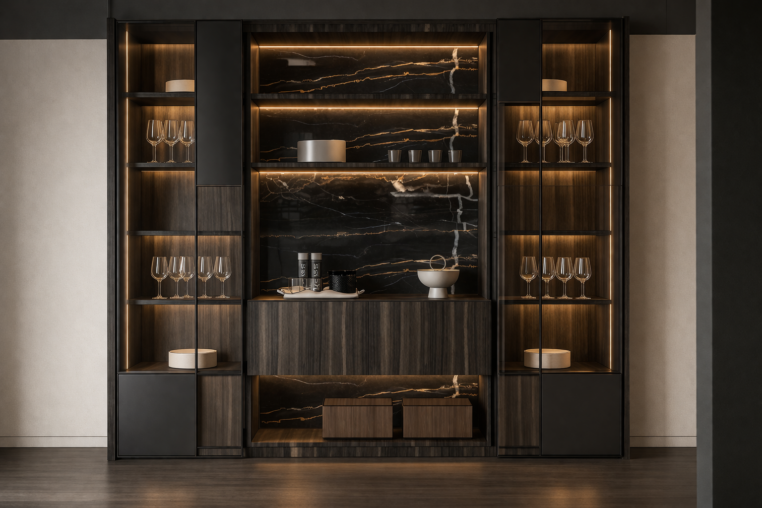 Os armários se destacam pelas portas revestidas em couro, expressão de um refinado travalho de acabamento, e pelo sistema de abertura de 270 graus, que amplia a funcionalidade e a interação com o espaço interno. No centro da composição, a ilha Trolley introduz mobilidade e versatilidade: uma estrutura dinâmica pensada para armazenar, expor e organizar com flexibilidade no cotidiano.