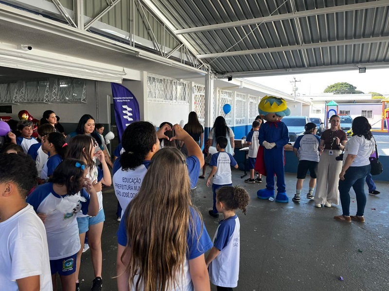 Mascote do Hospital Pequeno Príncipe interagindo com os estudantes. Crédito: Rodrigo Zanotto