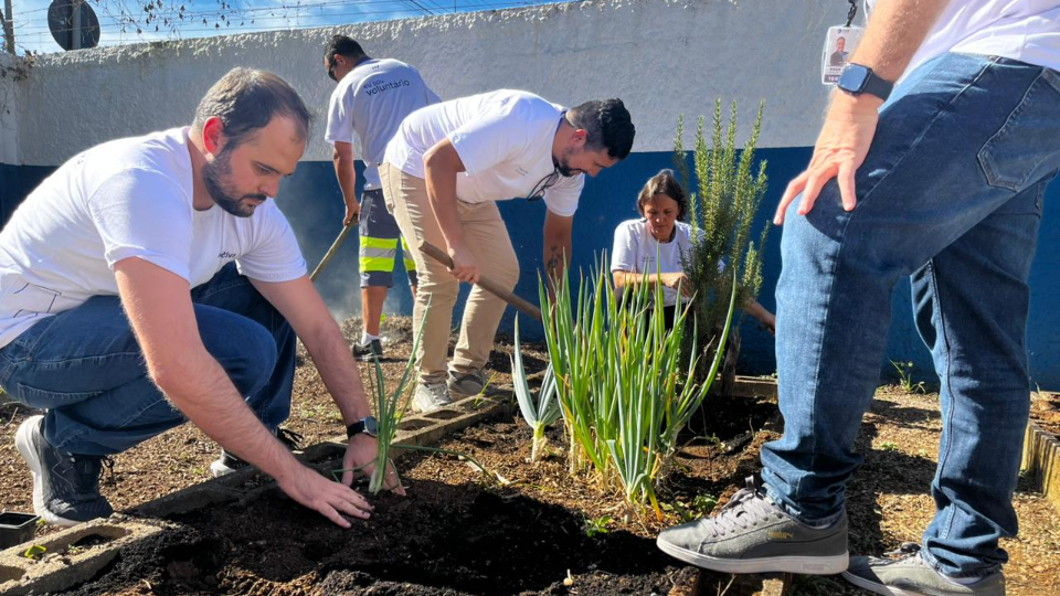 Colaboradores da Motiva Aeroportos plantando mudas na horta da escola. Crédito: Rodrigo ZanottoCerca de 30 voluntários do Aeroporto Internacional Afonso Pena e do Aeroporto de Bacacheri, administrados pela Motiva Aeroportos, realizaram nesta terça-feira (22) uma ação de voluntariado na Escola Municipal Professora Lourdes Bonin, em São José dos Pinhais, com atividades voltadas à sustentabilidade, saúde mental e integração com os alunos.
