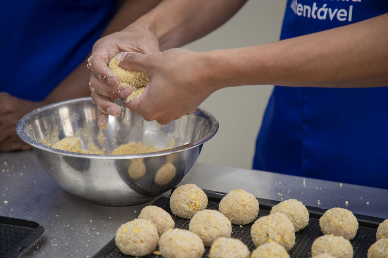 Nas aulas práticas do curso de Gastronomia Sustentável, os alunos aprendem algumas receitas como Nuggets Caseiros e Caponata de Berinjela.